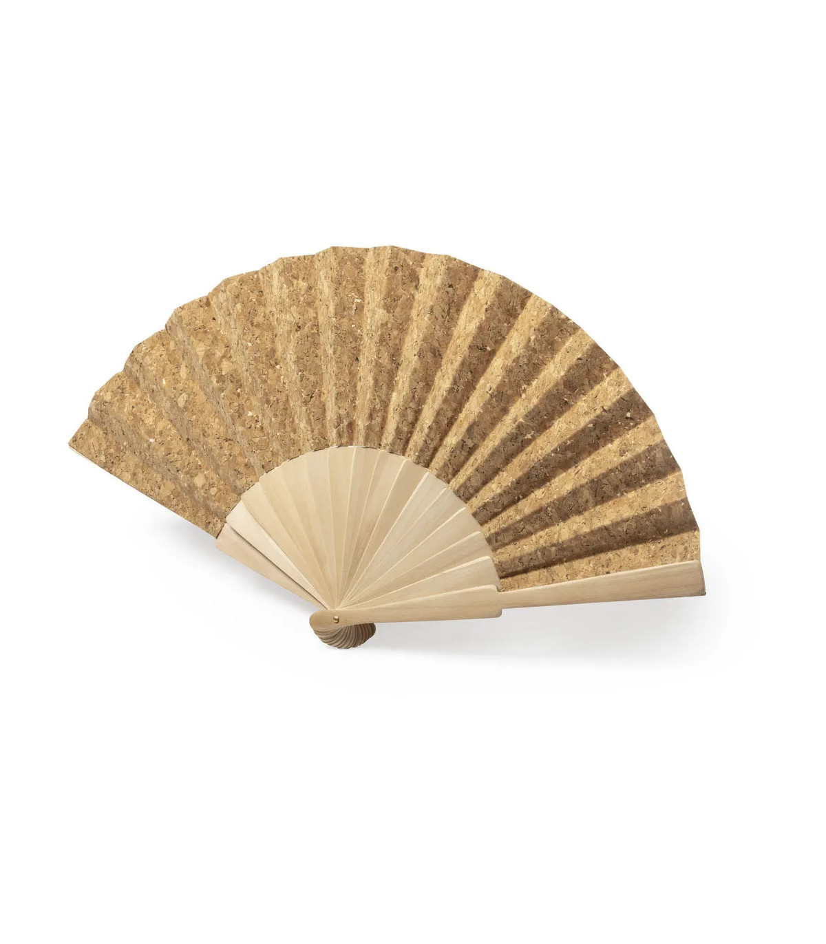 Abanico de línea nature, con varillas de madera y tela en corcho natural. Presentado en caja individual de diseño eco.