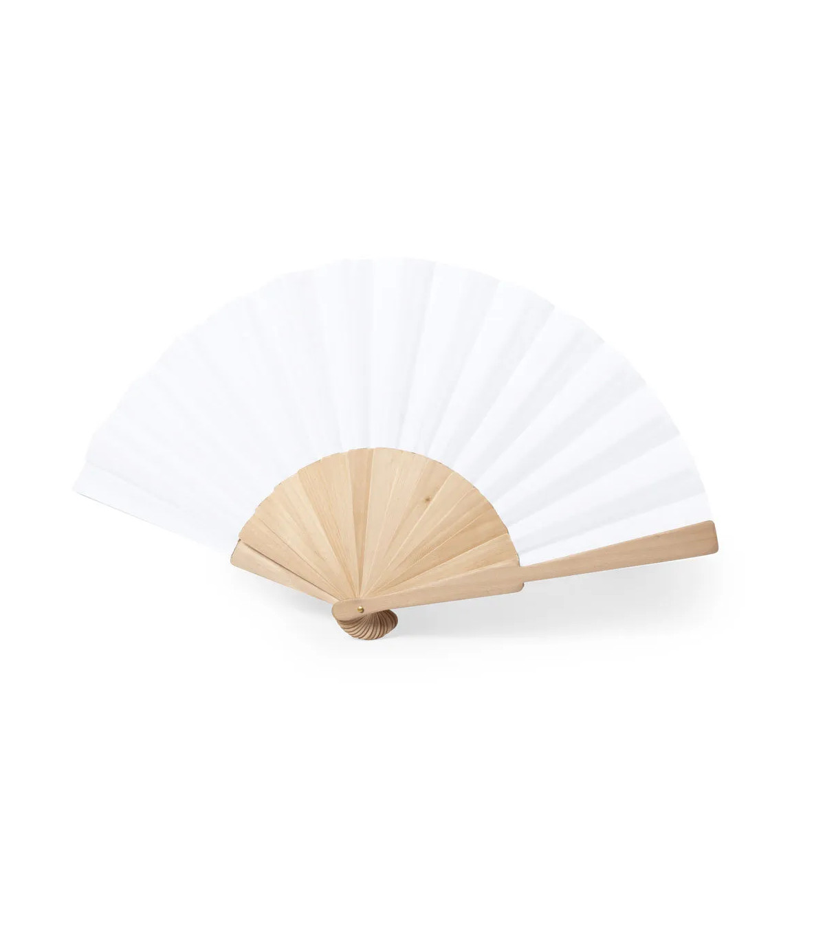 Abanico de línea nature, con varillas de madera y tela en RPET, elaborado a partir de plástico reciclado, para así fomentar la reutilización de residuos plásticos y ayudar a la sostenibilidad del planeta. Presentado en caja individual de diseño eco.
