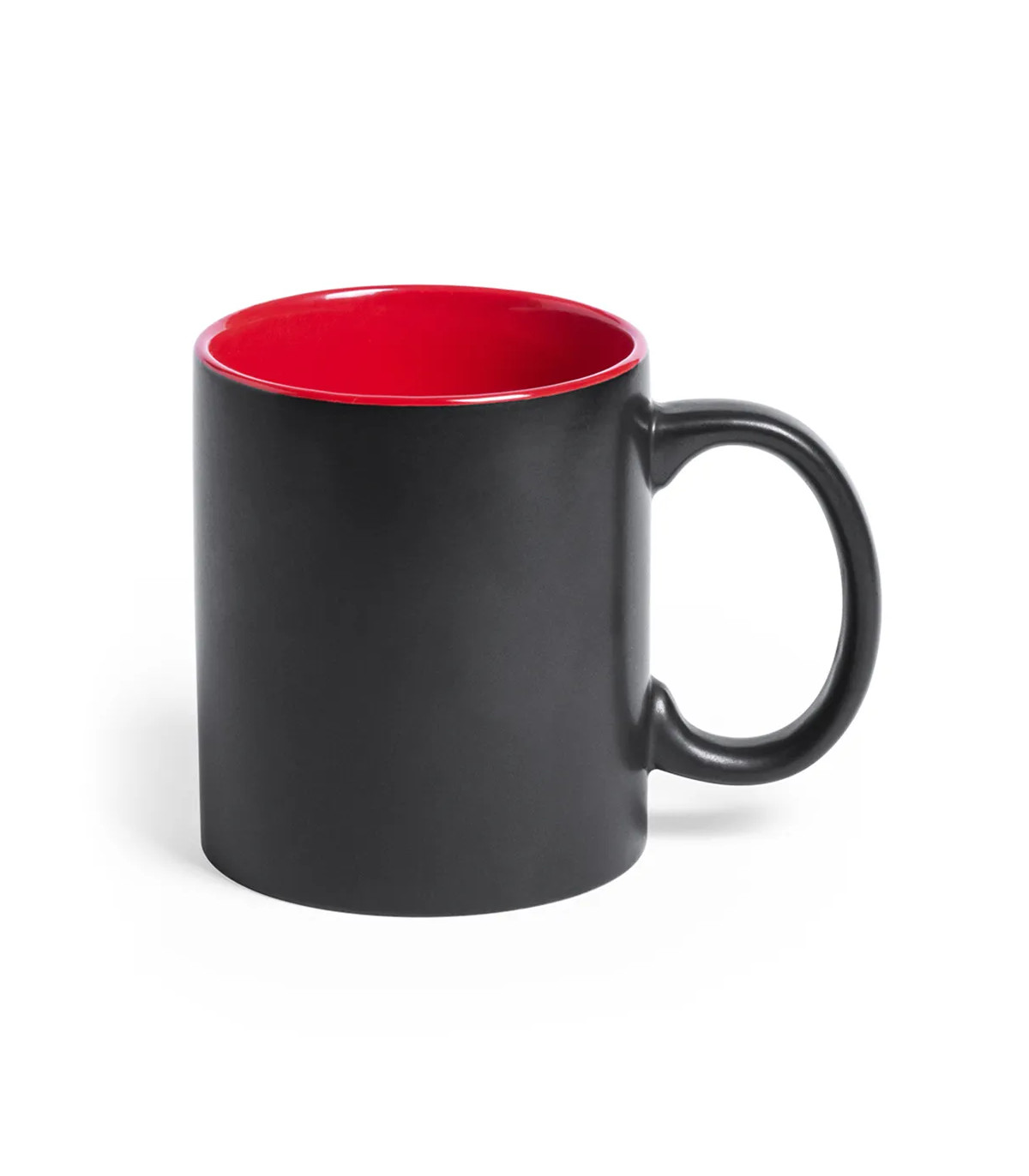 Taza de cerámica de 350ml de capacidad en divertida combinación de exterior en color blanco e interior en gama de vivos colores. Con cuchara de cerámica a juego integrada en asa y presentada en caja individual.