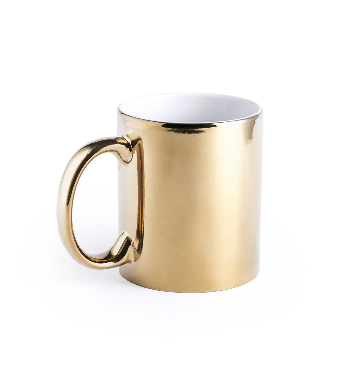 Taza de cerámica de 350ml de capacidad. Disponible en llamativos colores plateado y dorado brillantes. Especialmente diseñada para marcaje en láser y con un recubrimiento exterior especial para que tu publicidad quede perfectamente grabada en color blanco, a juego con el color interior de la taza. Presentada en caja individual.
