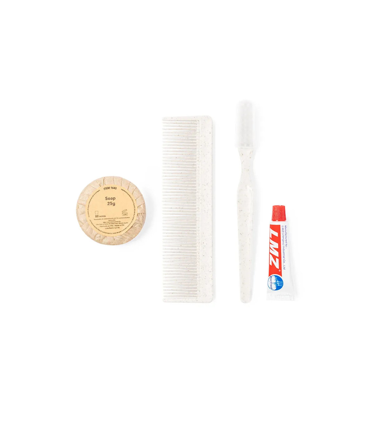 Set de aseo esencial con cepillo de dientes, pasta de dientes, peine y jabón. Contenido: Cepillo de dientes y peine fabricados en caña de trigo, para así fomentar la utilización de materias primas naturales y reducir las emisiones contaminantes. Pasta dentífrica en tubo de 6 gr, con tapón a rosca. Pastilla de jabón de 20 gr. Set presentado en caja individual de diseño kraft.