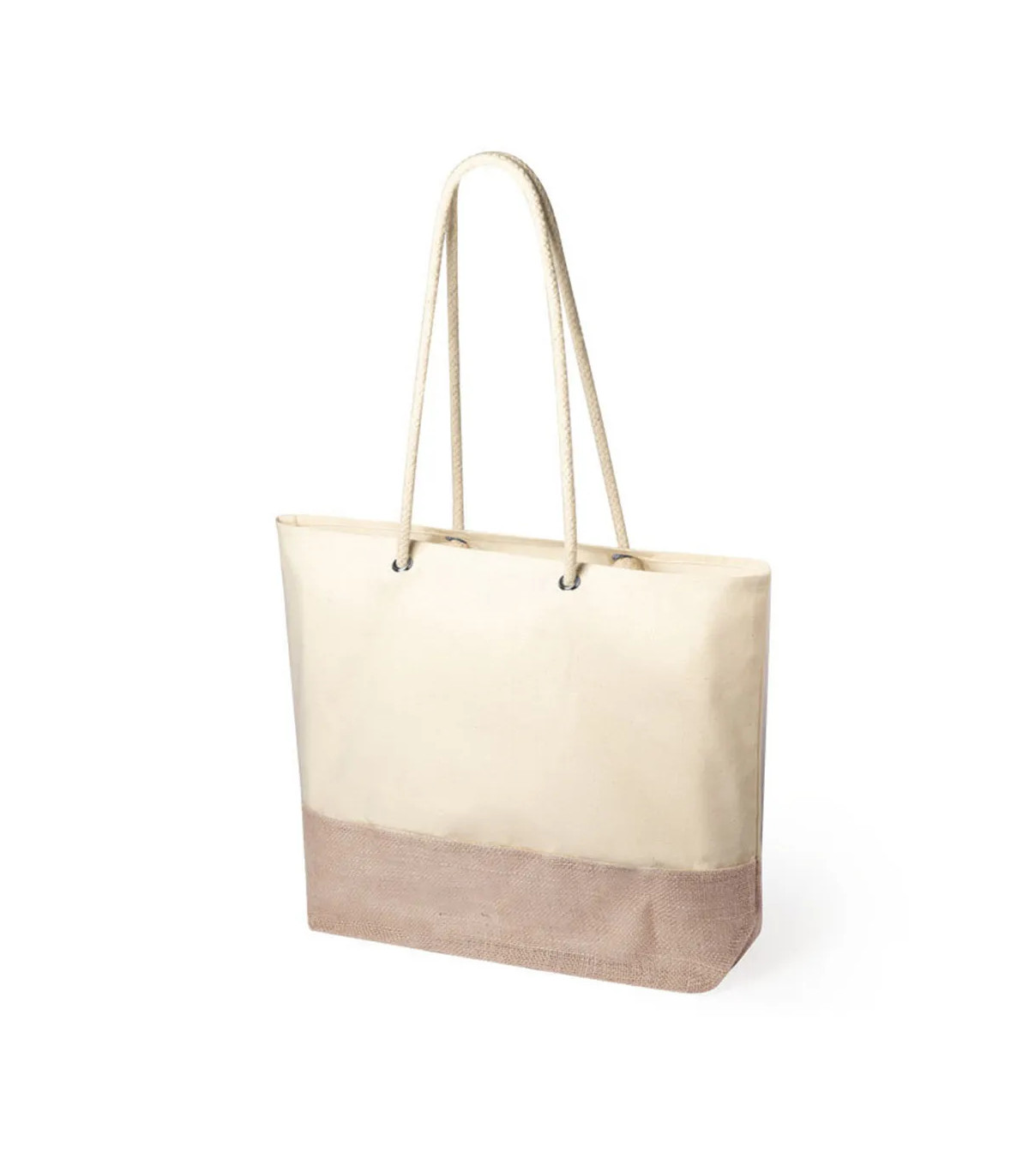 Bolsa de línea nature, en combinación de materiales yute y algodón. Tamaño 48 x 35 + 15 cm, de acabado cosido y con asas largas reforzadas de 90 cm en algodón. Resistencia de hasta 9 kg de peso.