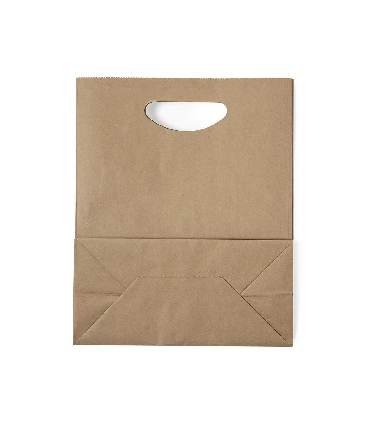 Bolsa ligera de línea nature fabricada en papel reciclado de 80g/m2. Con original asa troquelada y fuelle.