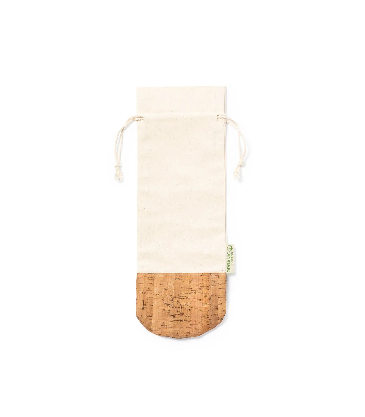 Bolsa para botellas de línea nature. Fabricada en algodón orgánico 100%, con cierre de cordón y base en corcho natural. Ideal para botellas de 750 ml.