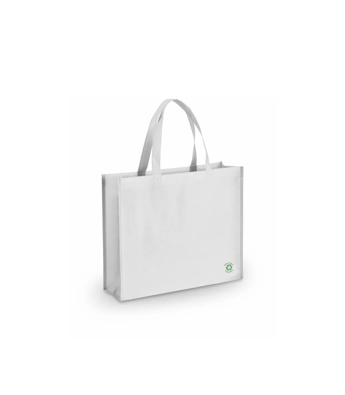 Bolsa en non-woven laminado de acabado brillante. En variada gama de vivos colores, con asas medianas reforzada de 48 cm de largo. De acabado cosido, con fuelles y ribetes reforzados.