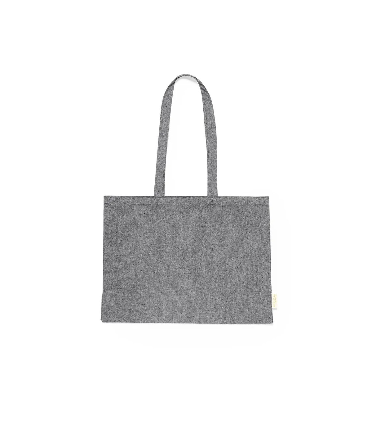 Bolsa de línea nature, fabricada en algodón reciclado de alto gramaje (240g/m2). De acabado cosido y con asas largas reforzadas (70 x 2,5 cm). Con fuelle y disponible en colores natural y negro, con distintivo algodón reciclado en etiqueta exterior. Resistencia hasta 10 kg de peso. Certificación GRS (Global Recycled Standard / Estándar de Reciclaje Global), que garantiza el origen reciclado del material usado para fabricar el producto