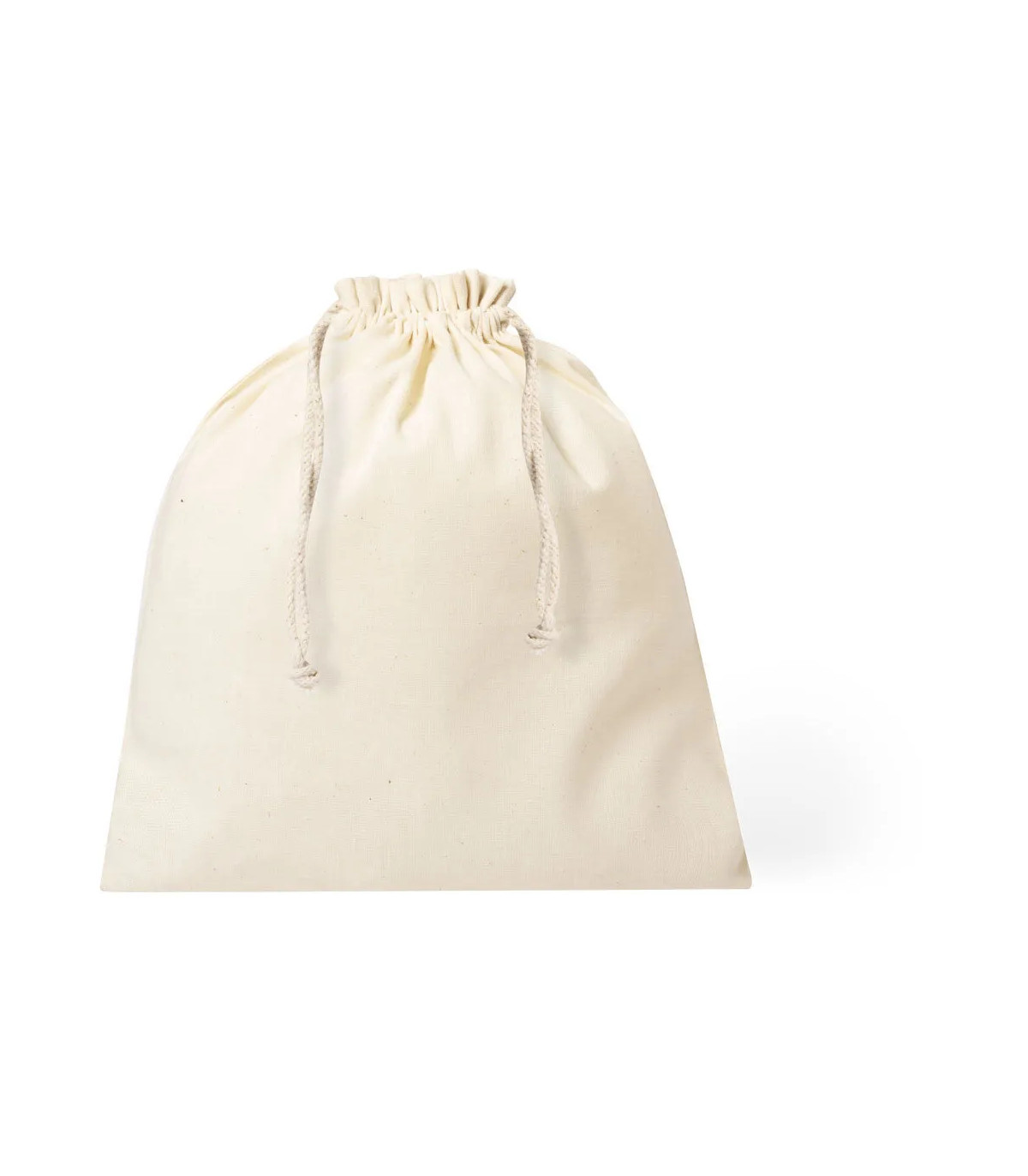 Bolsa de línea nature en material 100% algodón de 105g/m2. Tamaño 25x30 cm, de acabado cosido y con cordones autocierre de algodón.