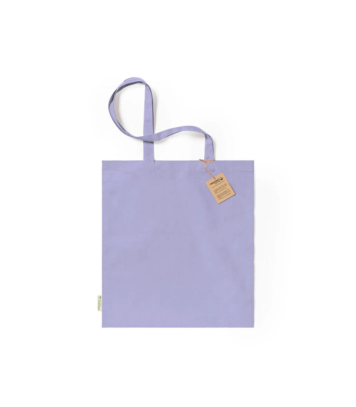 Bolsa fabricada en material100% algodón orgánico de 140g/m2. Con certificación GOTS (Global Organic Textile Standard, ó Norma Mundial de Textiles Orgánicos) que garantiza que los tejidos están hechos de fibras orgánicas. De acabaco cosido, con asas larga