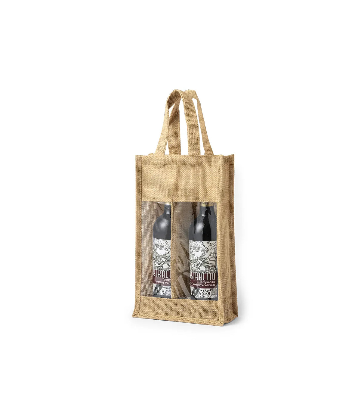 Resistente bolsa de yute laminado con compartimento individual para 2 botellas de vino de 75 cl. Con ventana transparente, ribetes y asas reforzadas.