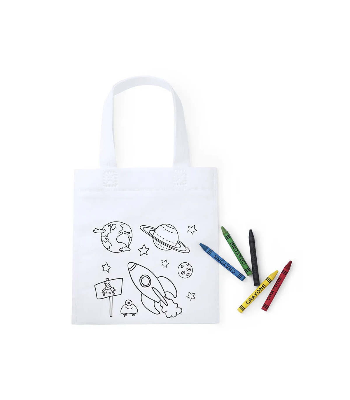 Bolsa de non-woven en color blanco especialmente diseñada para colorear con ceras. Incluye 5 ceras de cuerpo cilíndrico en variados colores. Asas largas de 33cm y acabado termosellado.