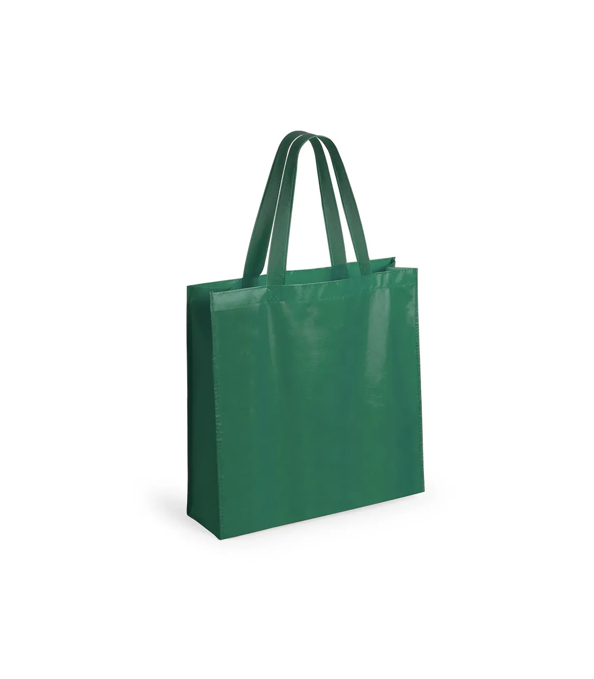 Bolsa en non-woven laminado de acabado mate de 110g/m2, en variada gama de vivos colores. Con asas reforzadas medianas de 55cm, fuelle y acabado cosido. Resistencia hasta 9kg de peso.
