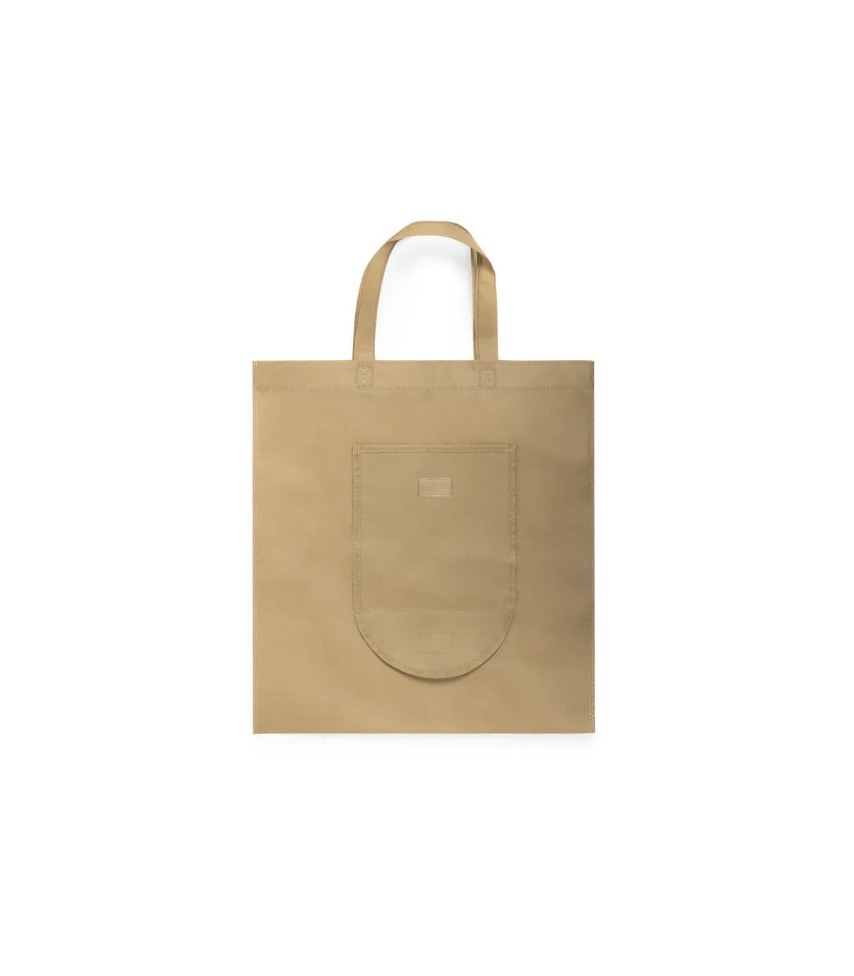 Bolsa plegable y reutilizable de inspiración nature en non-woven de 80g/m2. Tamaño 38x42 cm, de acabado termosellado y con asas medianas reforzadas de 40 cm. Plegado de pequeño tamaño con cierre de botón para cómodo transporte. Resistencia de hasta 7 kg d
