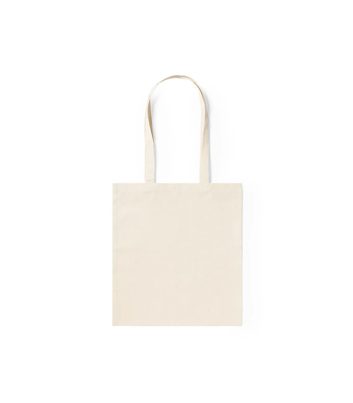 Bolsa en resistente material 100% algodón de 240g/m2 con acabado en color natural. Con asas largas reforzadas de 70cm y acabado cosido. Resistencia hasta 9kg de peso.
