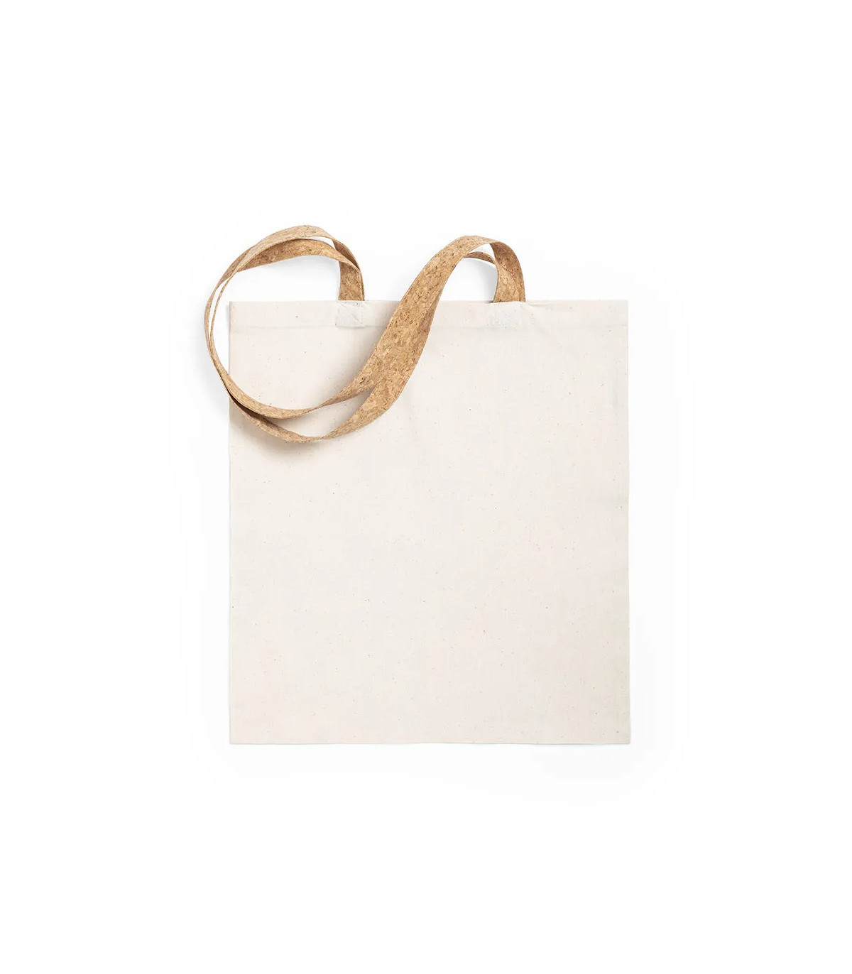 Bolsa de línea nature en resistente algodón de 180g/m2 y originales asas en corcho natural de 70cm reforzadas. Acabado cosido y resistencia hasta 8kg de peso.
