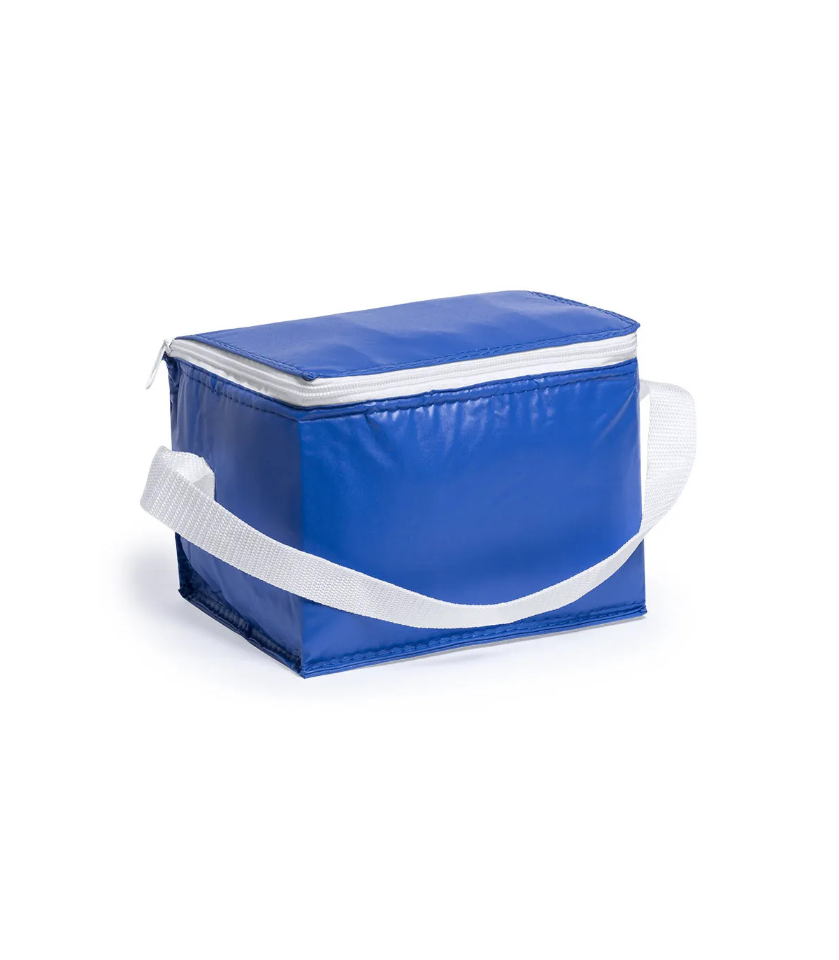 Nevera de 6 latas en resistente PVC de vivos colores. Interior isotermo en acabado de aluminio. Con cremallera y asa de transporte en color blanco a juego.