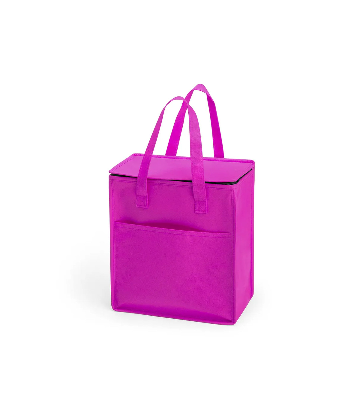 Innovadora bolsa térmica en papel laminado, resistente a las salpicaduras de agua y con interior en aluminio. Tamaño 43x33+14 cm, con cierre de cremallera y amplio bolsillo en frontal. Asas medianas reforzadas de 45...