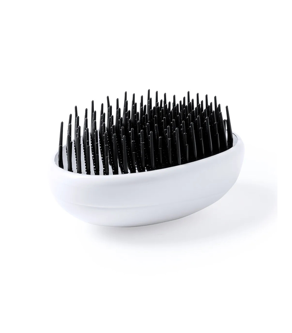 Cepillo de diseño minimalista con sistema antienredo y púas de diferentes longitudes.