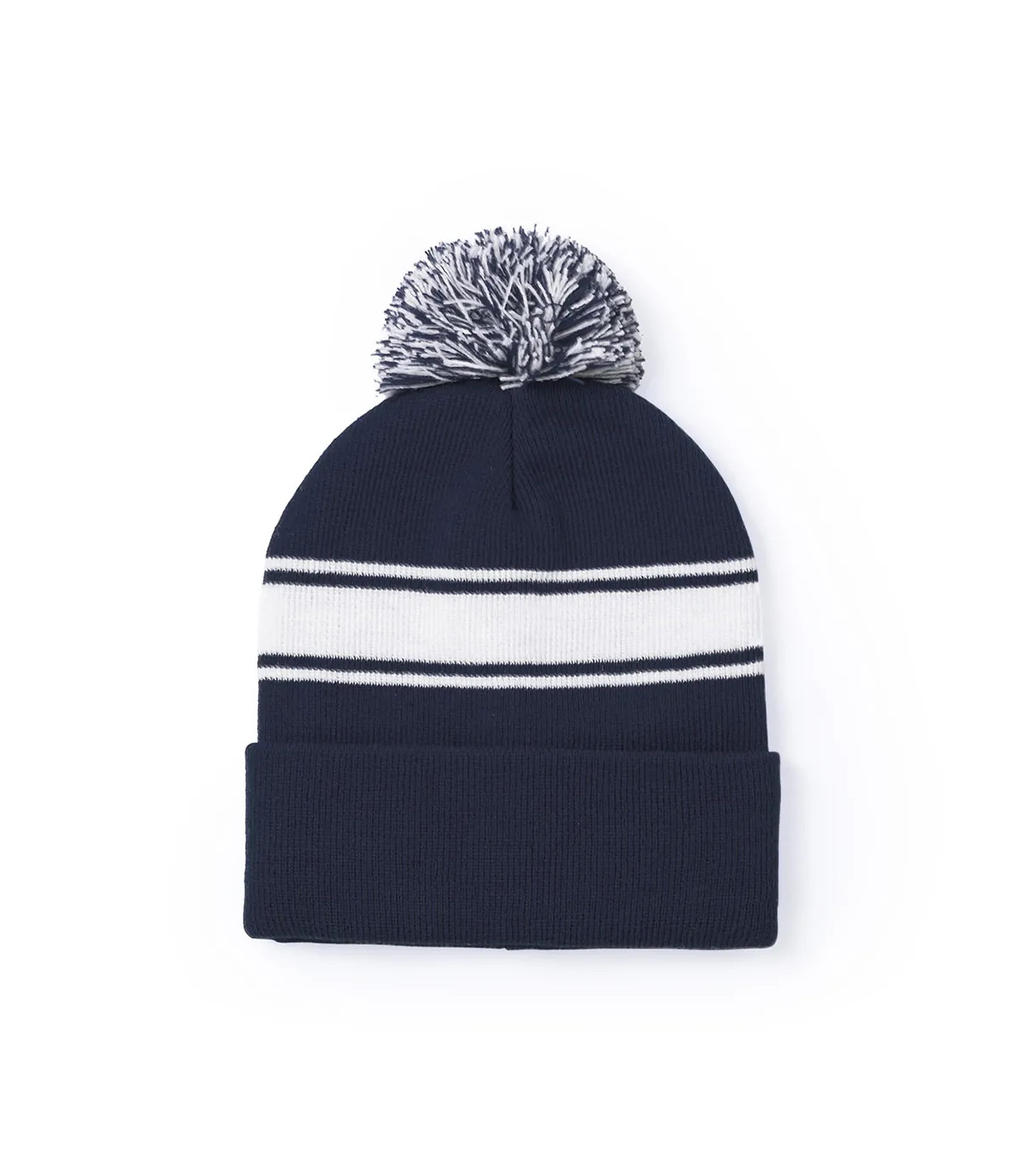 Suave y cálido gorro de material acrílico en variada gama de colores. De original diseño, con tira frontal de color blanco y pom pom bicolor a juego.