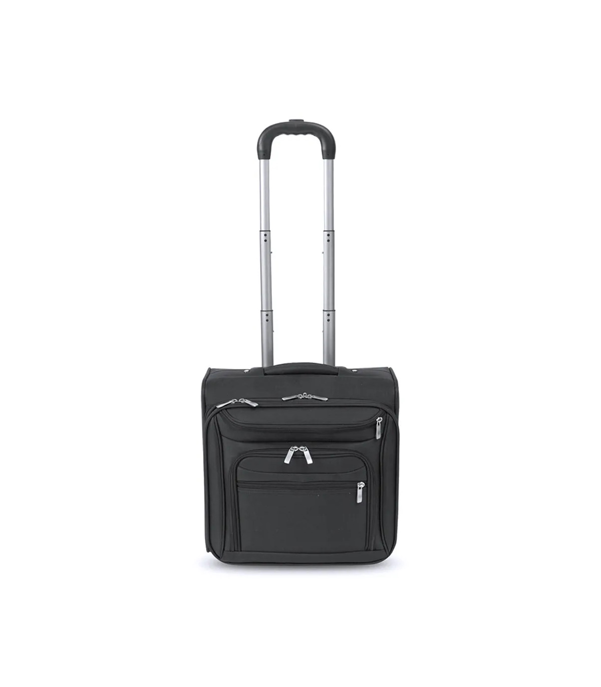 Trolley de negocios multibolsillo de 2 ruedas acabado en resistente poliéster 1200D. De elegante color negro, con asa exterior reforzada a juego, cremalleras con orificio para candado -incluido- y prácticos bolsillos en parte frontal. Con identificador, cierre de seguridad de combinación numérica y cremalleras a juego, incluye además compartimento interior acolchado para ordenador portátil de hasta 17 pulgadas y multitud de bolsillos y fundas para bolígrafos interiores.