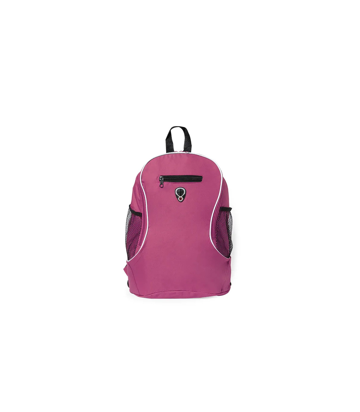 Mochila en resistente poliéster 600D de desenfadado diseño, con cierre de cremallera, salida para auriculares, bolsillo frontal y bolsillos elásticos de redecilla a los lados. Accesorios en color negro, con cintas de hombros ajustables con acolchado.