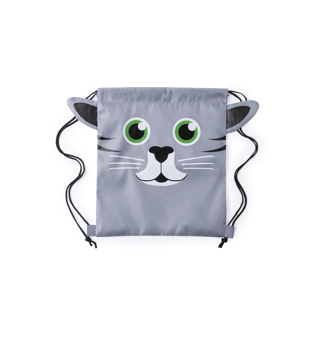 Mochila de cuerdas plegable para niño, en suave poliéster 210T de originales diseños con animalitos. Con cuerdas autocierre en color negro y esquinas reforzadas. Plegado de pequeño tamaño.