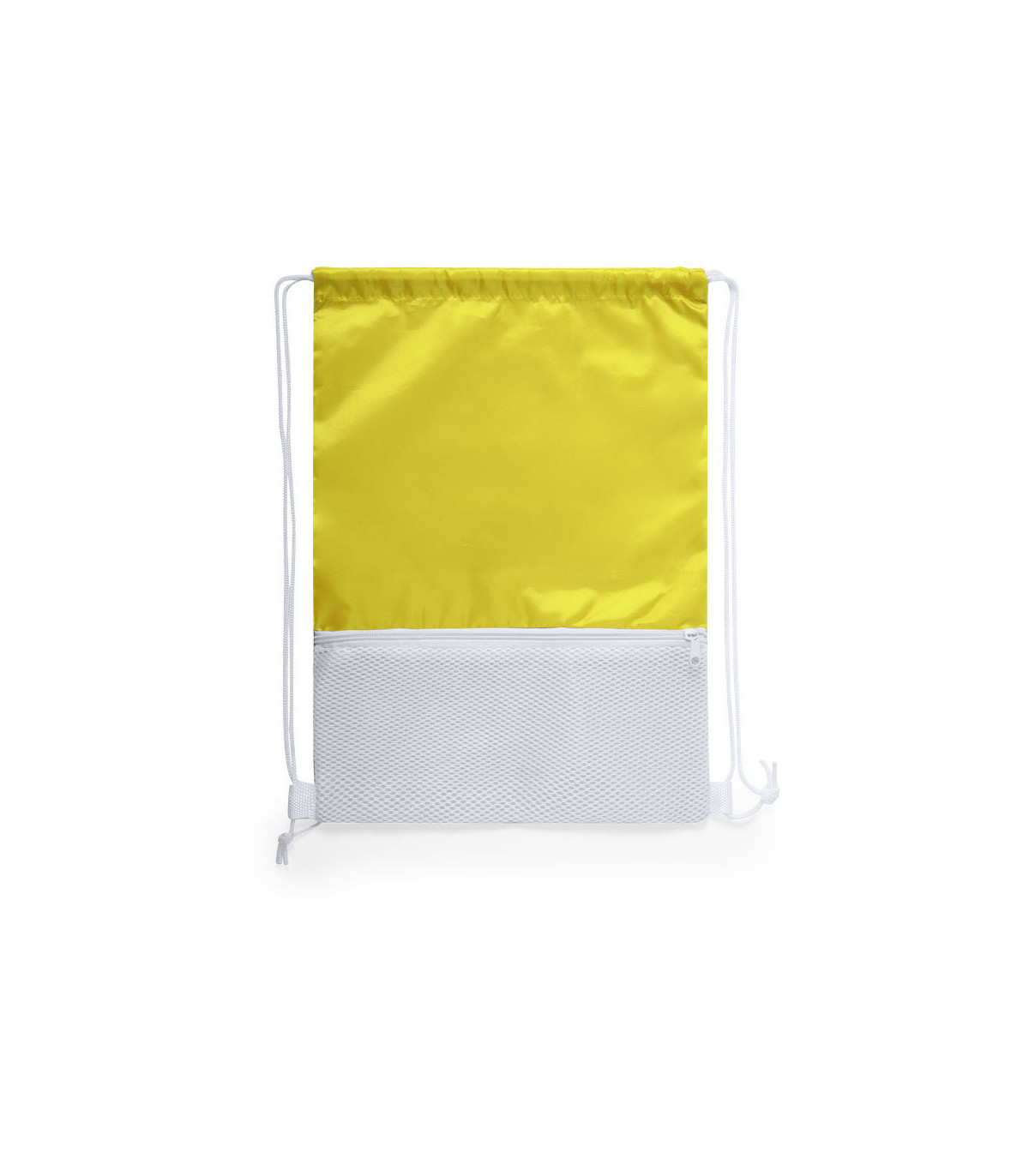 Mochila de cuerdas en suave poliéster 210D de original diseño bicolor. Con bolsillo frontal de redecilla con cierre de cremallera en color blanco. Cuerdas autocierre en color blanco y esquinas reforzadas. Disponible en variada gama de colores.