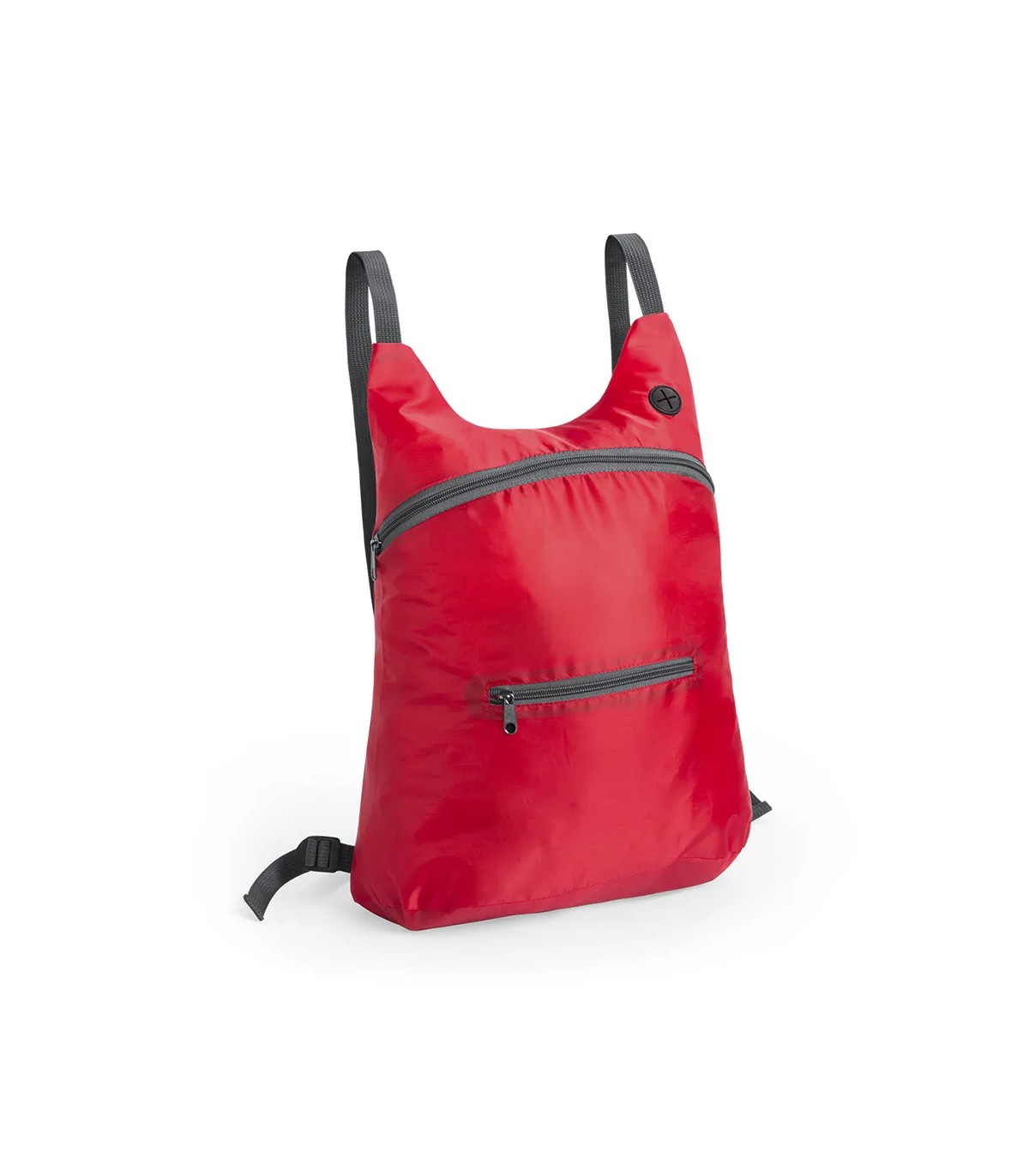 Mochila plegable en suave poliéster 201D de alegres colores, con cierre de cremallera, bolsillo frontal y salida de auriculares. Con esquinas reforzadas, cintas de hombro regulables y accesorios en color gris. Plegado de pequeño tamaño con cinta de transporte.