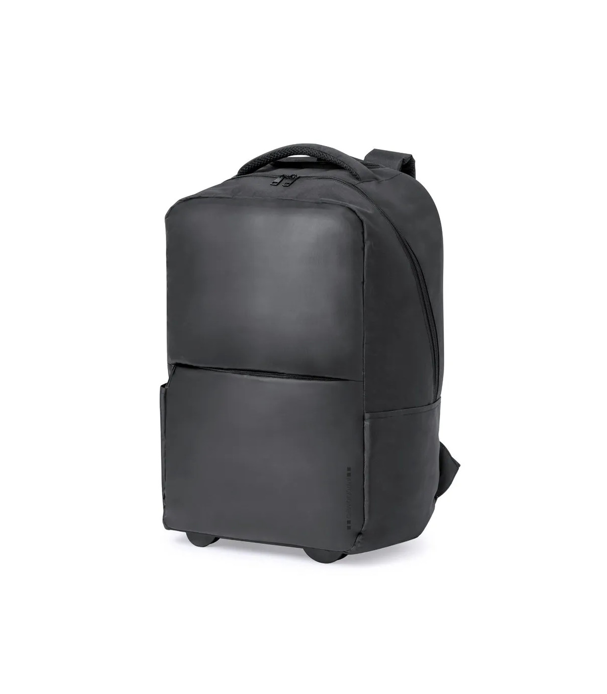 Mochila trolley de Antonio Miró, fabricada en resistente poliéster 300D con acabados en negro. Compartimento principal y bolsillo exterior con cierre de cremallera a juego, asa de transporte acolchada y bolsillos laterales; con logotipo de la marca en un lado. Compartimento interior acolchado para ordenador portátil de hasta 15 pulgadas y bolsillo para tablet de hasta 11 pulgadas. Cintas para hombros acolchadas y ajustables.