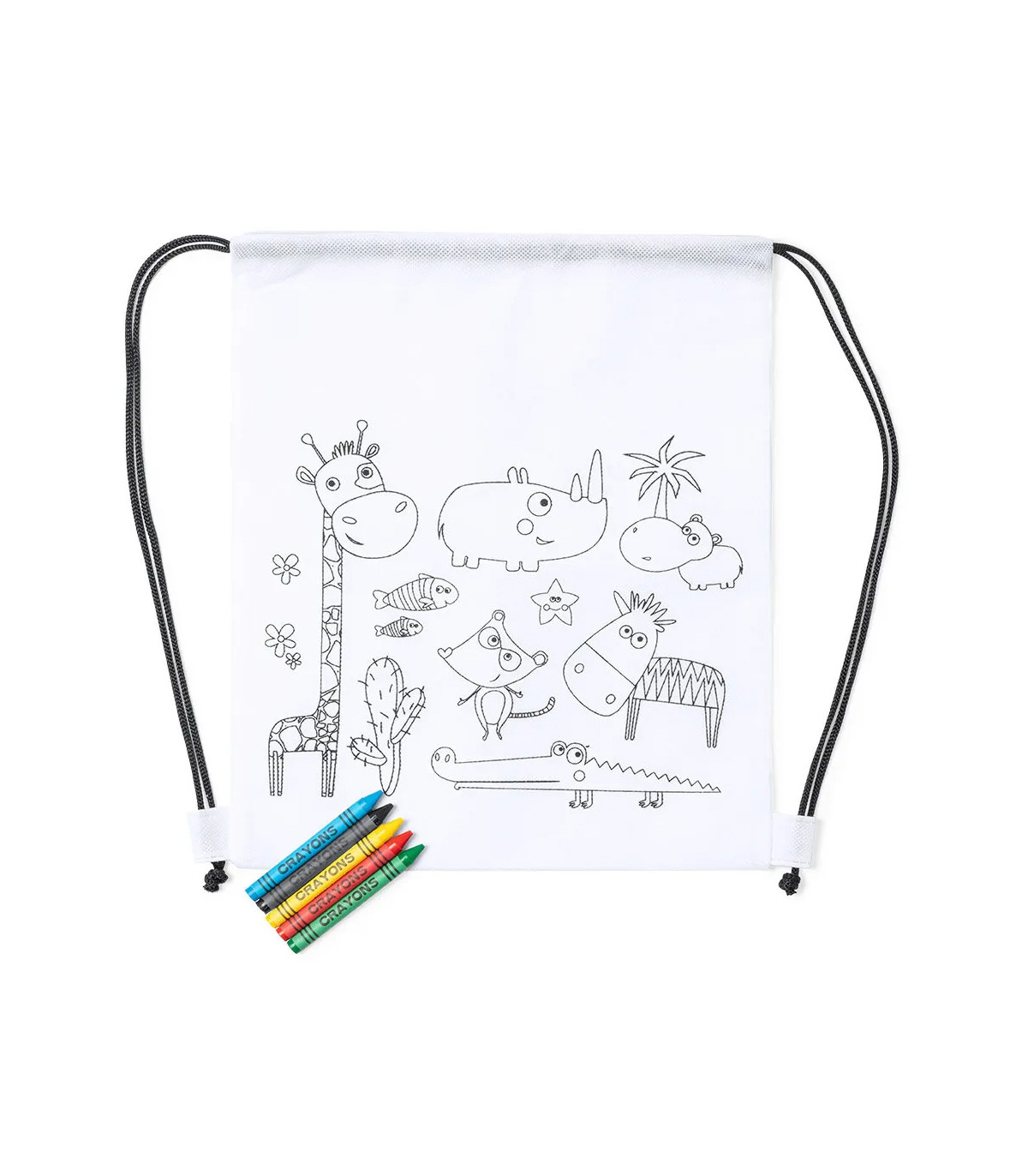 Mochila de non-woven en color blanco especialmente diseñada para colorear con ceras. Incluye 5 ceras de cuerpo cilíndrico en variados colores. Con cuerdas autocierre en color negro y refuerzo en las esquinas.