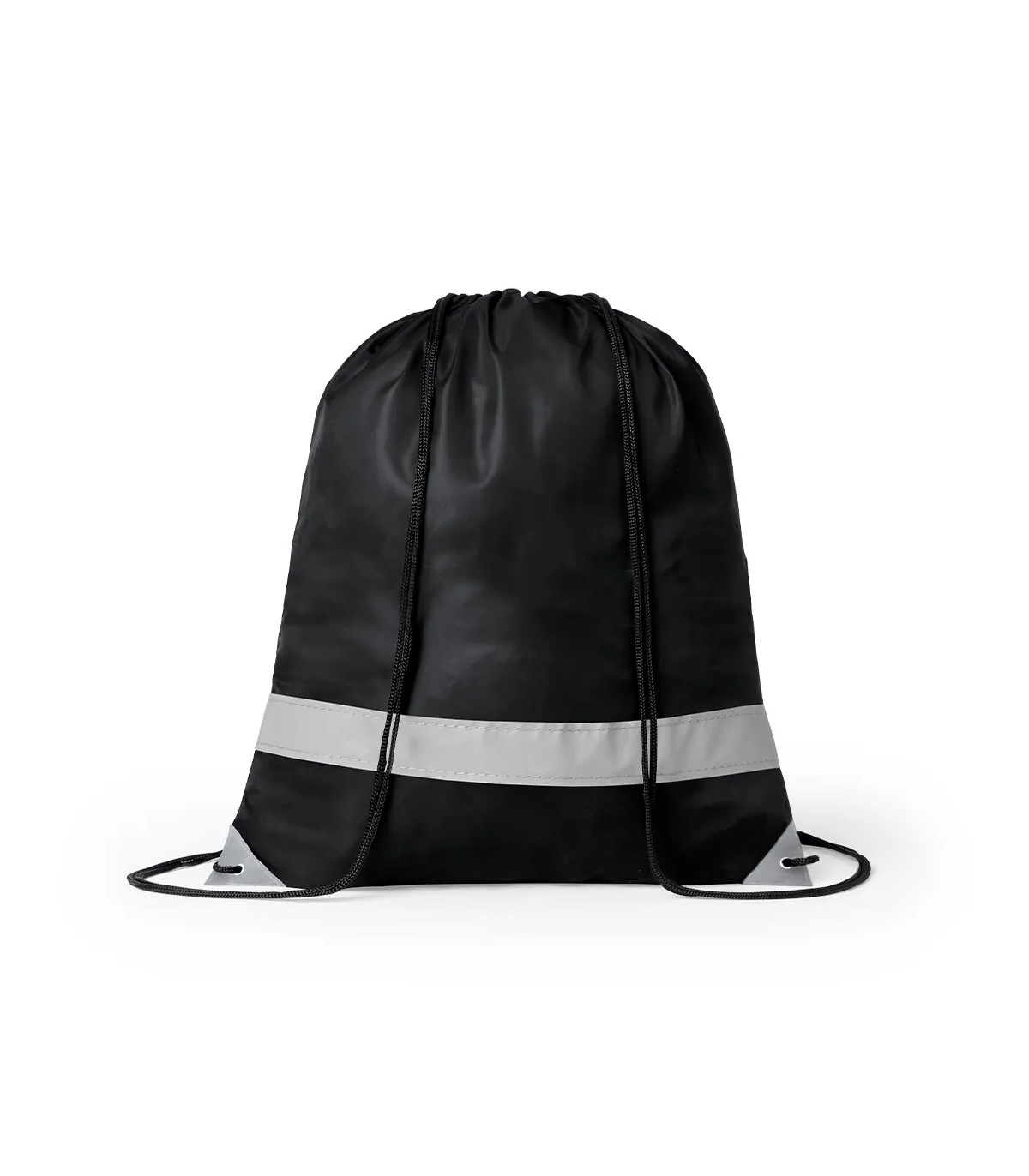 Mochila reflectante en suave poliéster 190T de alegres colores, con tira frontal reflectante. Cuerdas autocierre en color negro y esquinas reflectantes reforzadas con argollas metálicas.