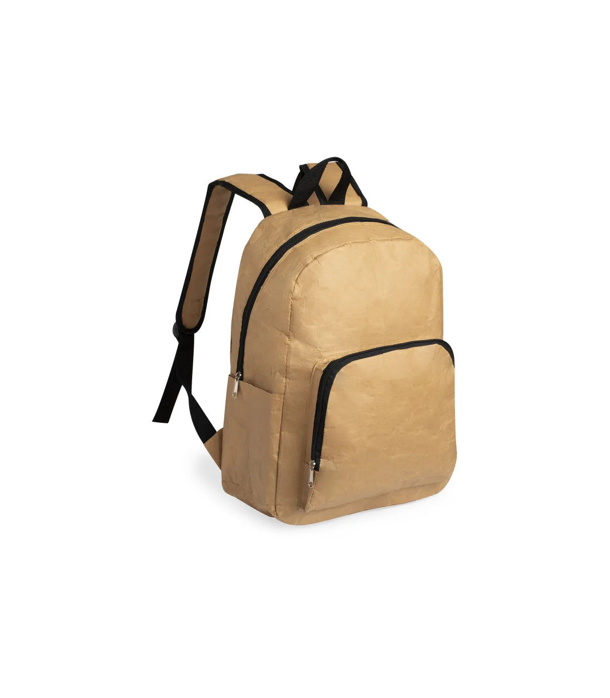 Innovadora mochila en papel laminado ultra resistente de 130 g/m2, resistente a las salpicaduras de agua. Compartimento principal y amplio bolsillo en frontal con cierres de cremallera. Asa de transporte y accesorios en color negro, con cintas de hombros acolchadas y ajustables.