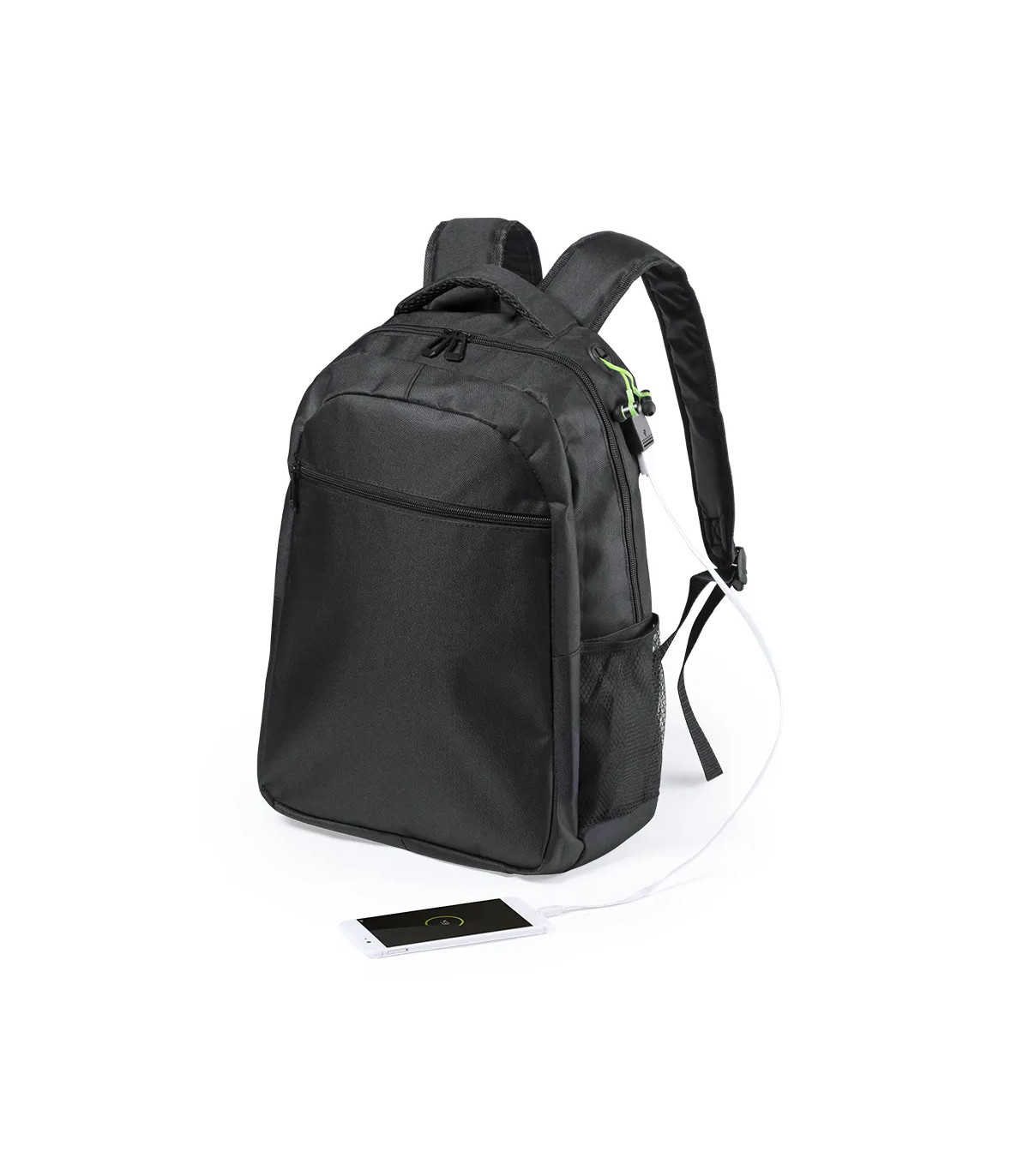 Mochila de resistente poliéster 600D en elegante acabado impermeable de color negro y salida para auriculares. Con compartimento interior con salida USB para conexión de powerbank -no incluido-. Interior con compartimento acolchado para ordenador portátil de hasta 15 pulgadas y tablets de hasta 10 pulgadas. Multitud de bolsillos interiores y exteriores. Cintas de hombros y espalda con acolchado ergonómico.
