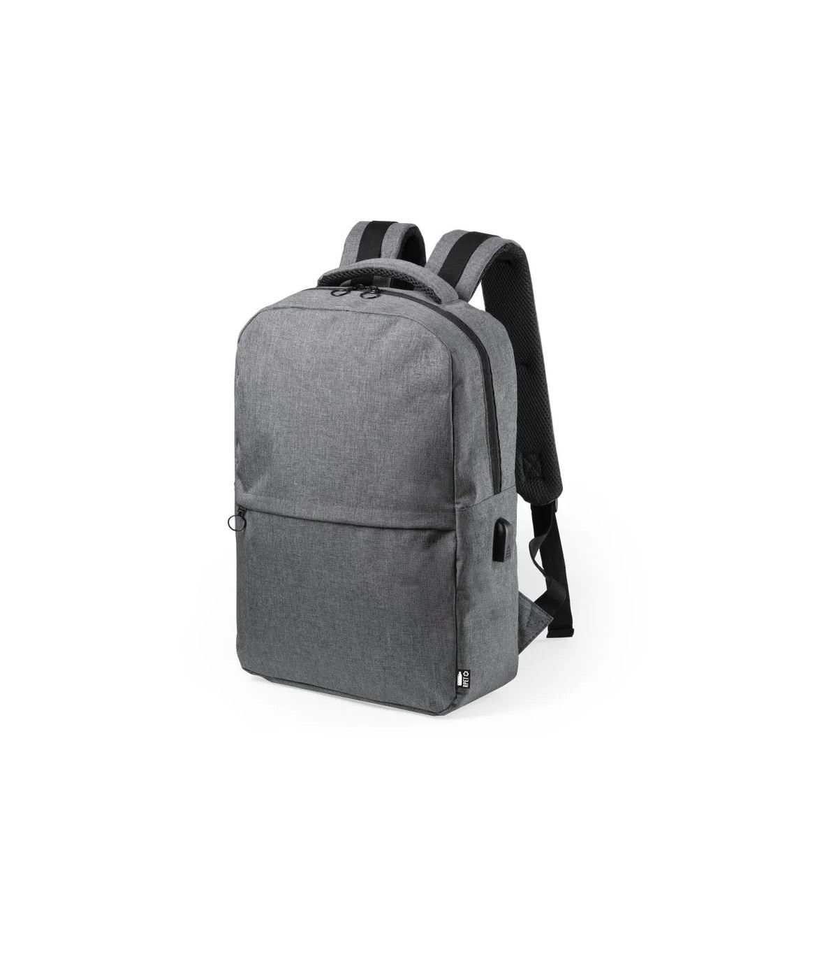 Mochila de negocios en resistente 600D RPET, elaborado a partir de plástico reciclado, para así fomentar la reutilización de residuos plásticos y ayudar a la sostenibilidad del planeta. Con cierre de cremallera de doble tirador y bolsillo en frontal. Interior con bolsillos acolchados para tablet de hasta 10 pulgadas y ordenador portátil de hasta 15 pulgadas, con estación de carga USB (cable incluido, batería auxiliar no incluida). Esquinas reforzadas, asa de transporte acolchada y accesorios en color negro. Espalda y cintas de hombros acolchadas y ajustables. Distintivo RPET en etiqueta,