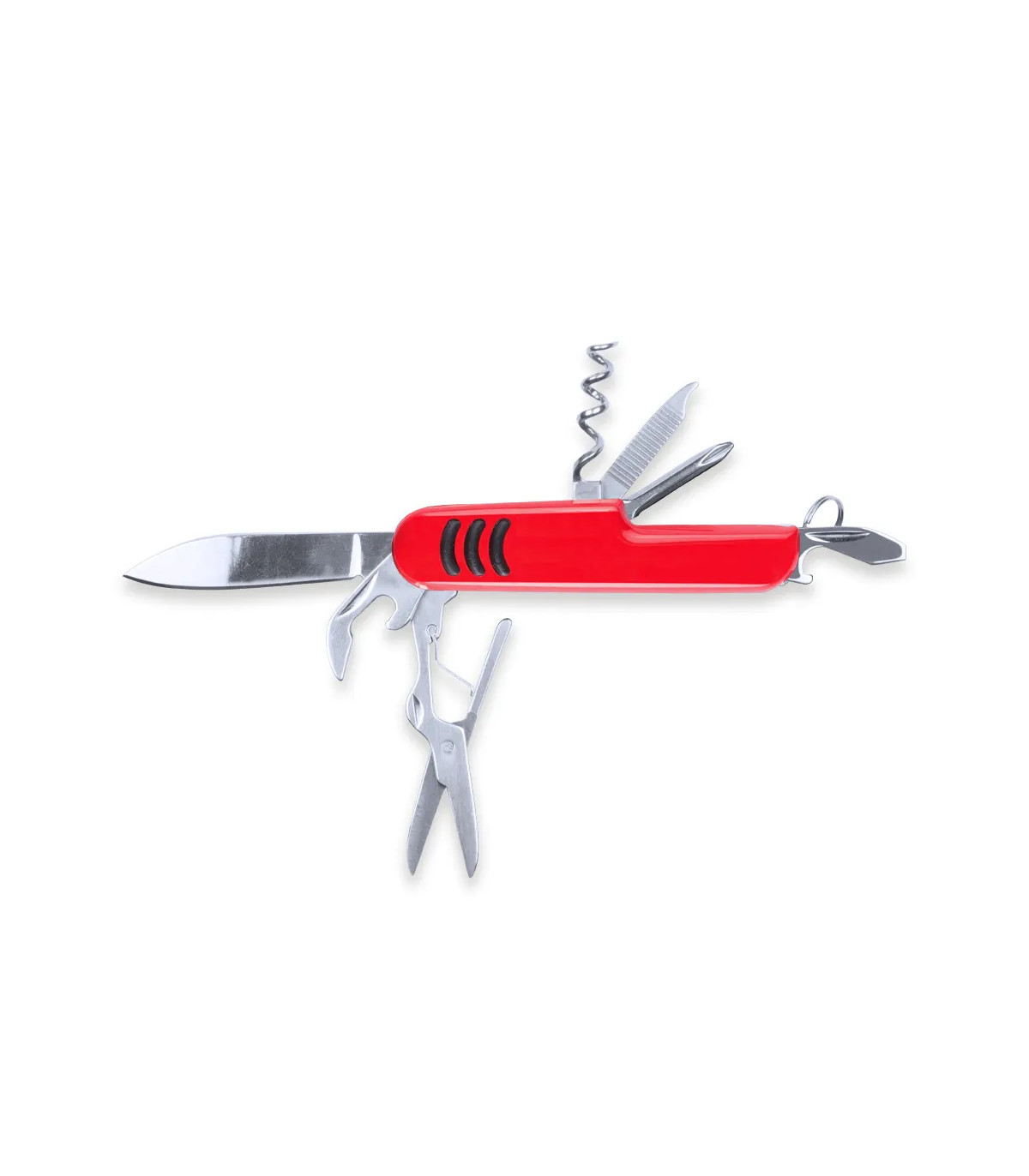 Navaja multiusos con accesorios de acero inox de 9 funciones y mango con accesorio anideslizante en vivos colores. Presentada en caja individual.