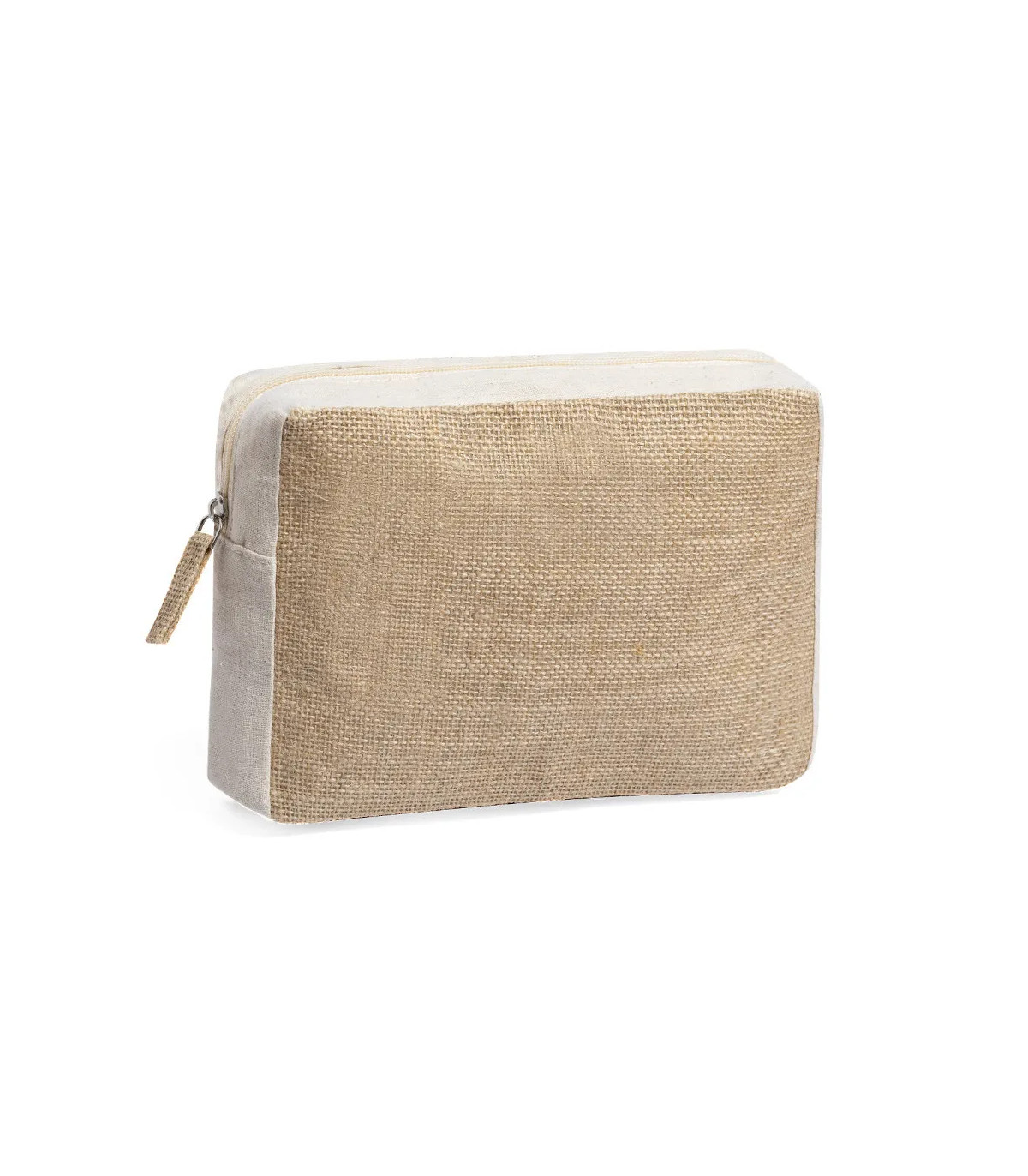 Neceser de línea nature en combinación de yute laminado y algodón natural. Con cierre de cremallera y tirador en yute a juego.