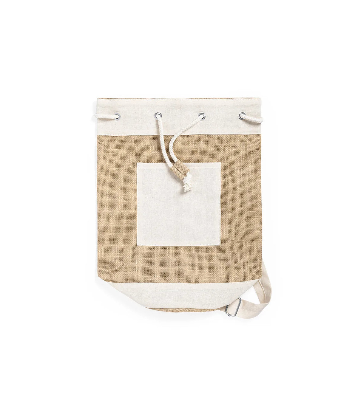 Petate multiusos de línea nature y diseño bicolor. Fabricado en yute, con detalles en algodón. Con cinta ajustable y bolsillo interior. Compartimento principal con argollas metálicas reforzadas y bolsillo frontal para fácil marcaje.