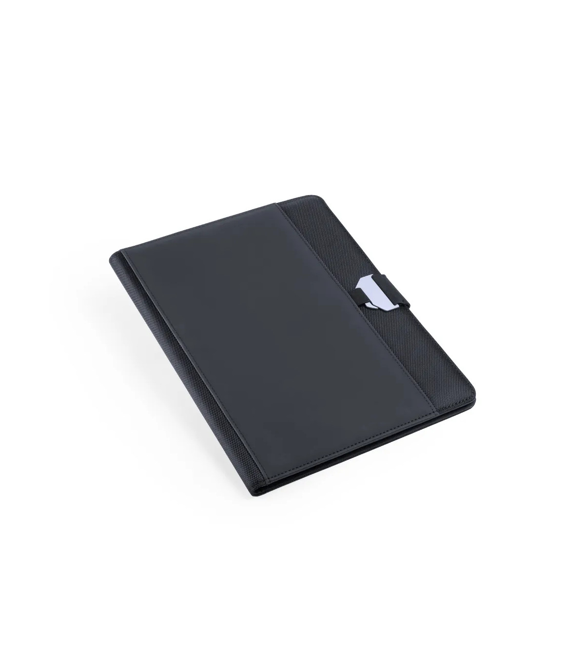 Carpeta tecnológica en elegante combinación de poliéster y suave polipiel y con original cierre metálico. Interior con compartimentos para memoria USB, powerbank, compartimento táctil para smartphone, tarjeteros y soporte para bolígrafo. Con bloc de notas extraíble de 20 hojas lisas y presentada en elegante caja negra.