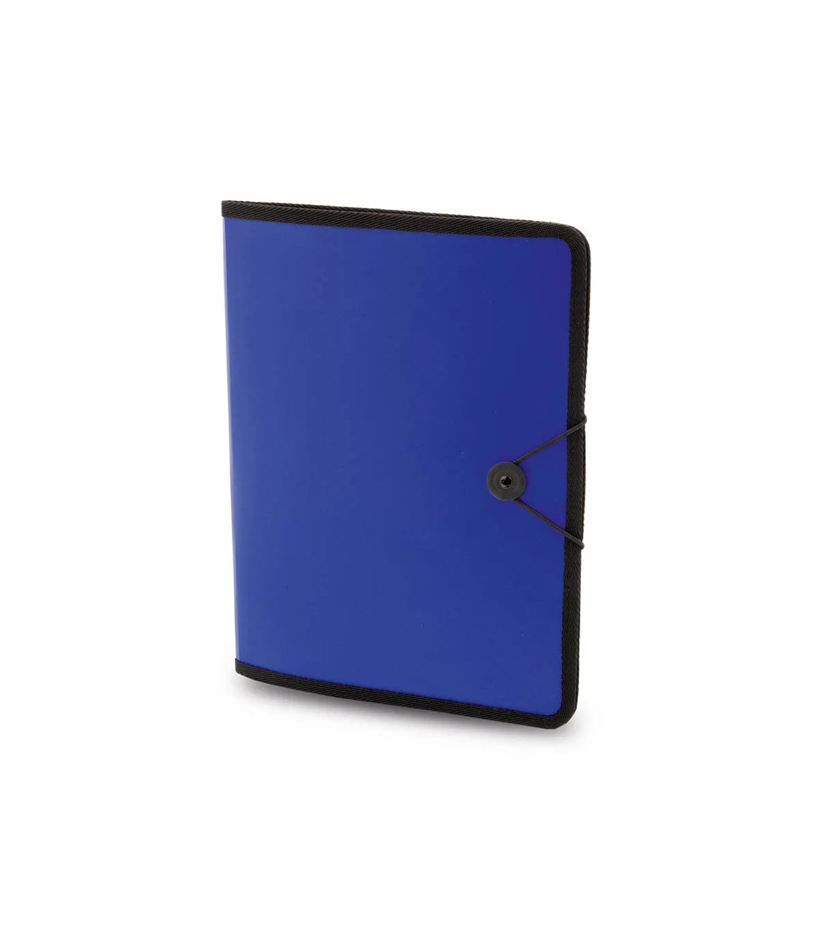 Carpeta con original cierre elástico en variados colores, de acabado brillante con ribete reforzado en negro. Interior con bloc extraíble de 30 hojas lisas, bolsillo transparente de solapa, tarjetero y soporte para bolígrafo.