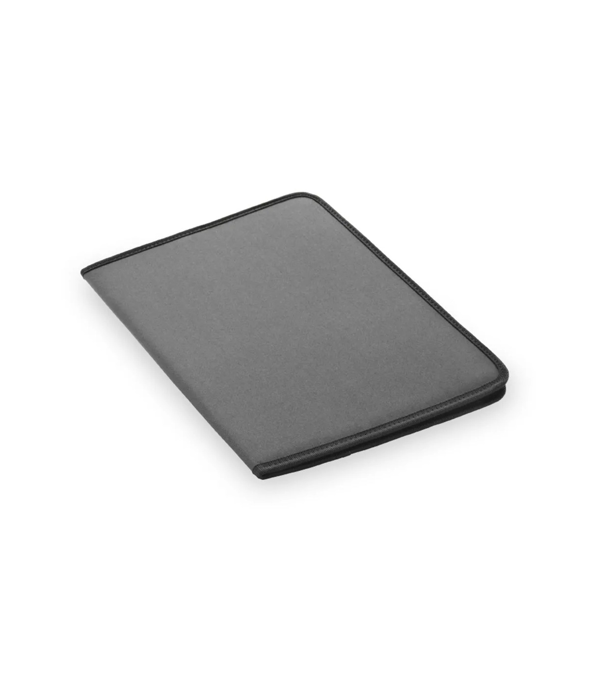 Carpeta en variados colores acabada en resistente poliéster 600D con ribete reforzado en negro. Interior con bloc extraíble de 20 hojas lisas, 2 bolsillos de solapa y soporte para bolígrafo.