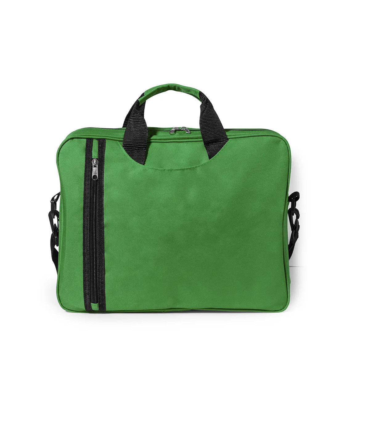 Portadocumentos de cierre de cremallera con original bolsillo frontal en vertical y compartimento bajo las asas en suave acabado de poliéster 600D en vivos colores. Con asas de transporte reforzadas a juego y cinta bandolera ajustable con cierres de mosquetón.