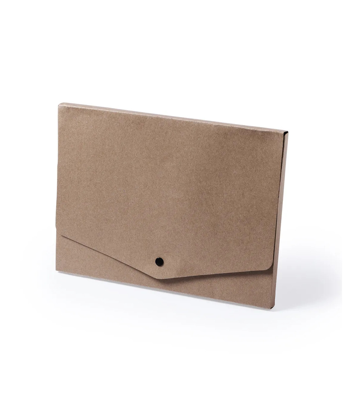 Portadocumentos en resistente cartón reciclado de acabado rígido con cierre de corchete en solapa.