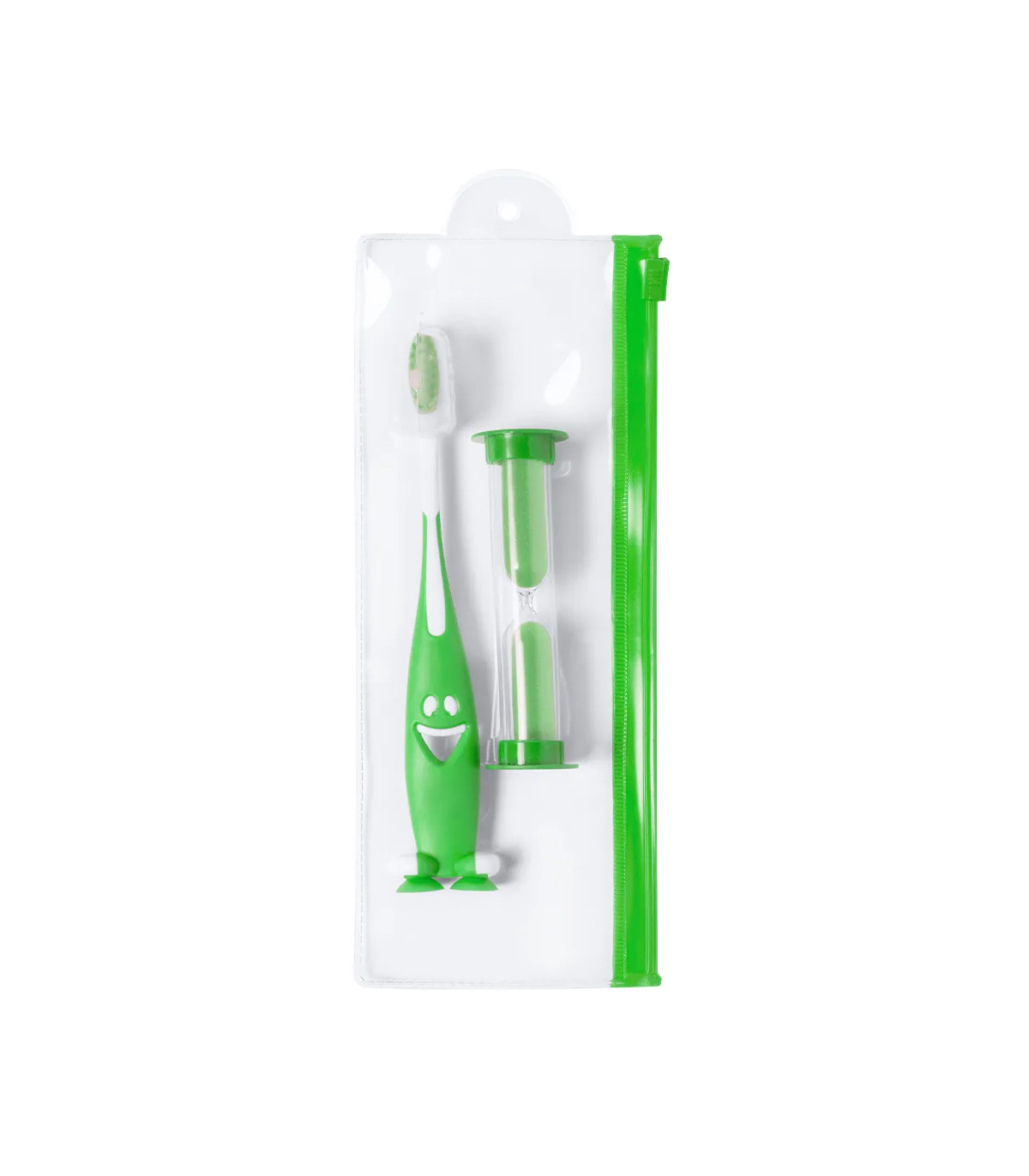 Set Cepillo de dientes y reloj de arena en llamativos colores. Incluye cepillo de divertido diseño y suave tacto con ventosas en la base y reloj de arena de 2 minutos de duración. Presentado en bolsa individual con cierre zip.