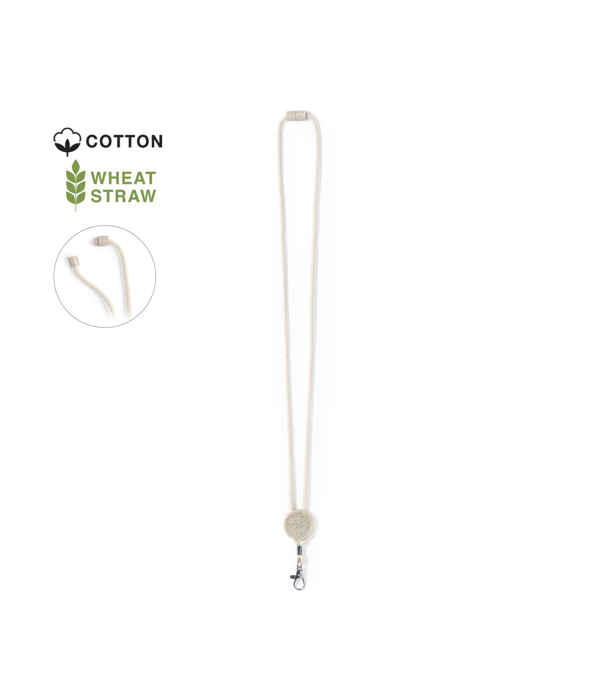 Lanyard de línea nature fabricado en resistente algodón 100%. Accesorio circular para personalización y cierre de seguridad en cuello fabricados en caña de trigo, con mosquetón metálico giratorio. La caña de trigo fomenta la utilización de materias primas naturales, reduciendo así las emisiones contaminantes.