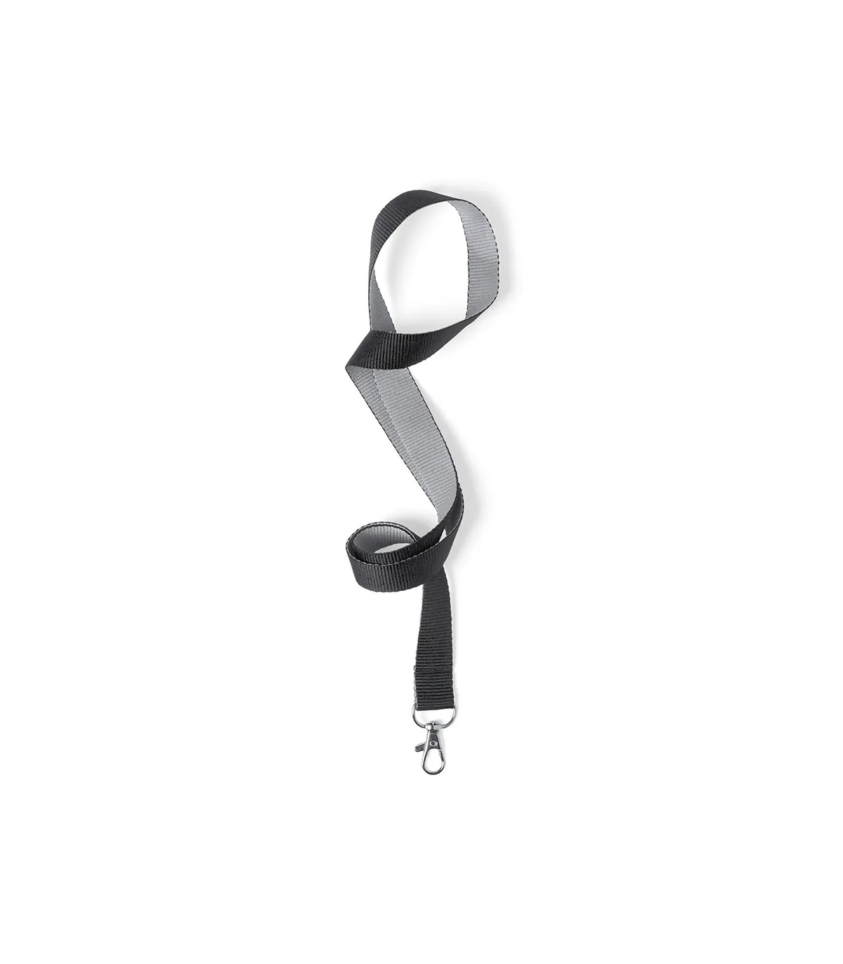 Original lanyard en resistente poliéster de diseño bicolor en vivos colores con cierre de mosquetón metálico.