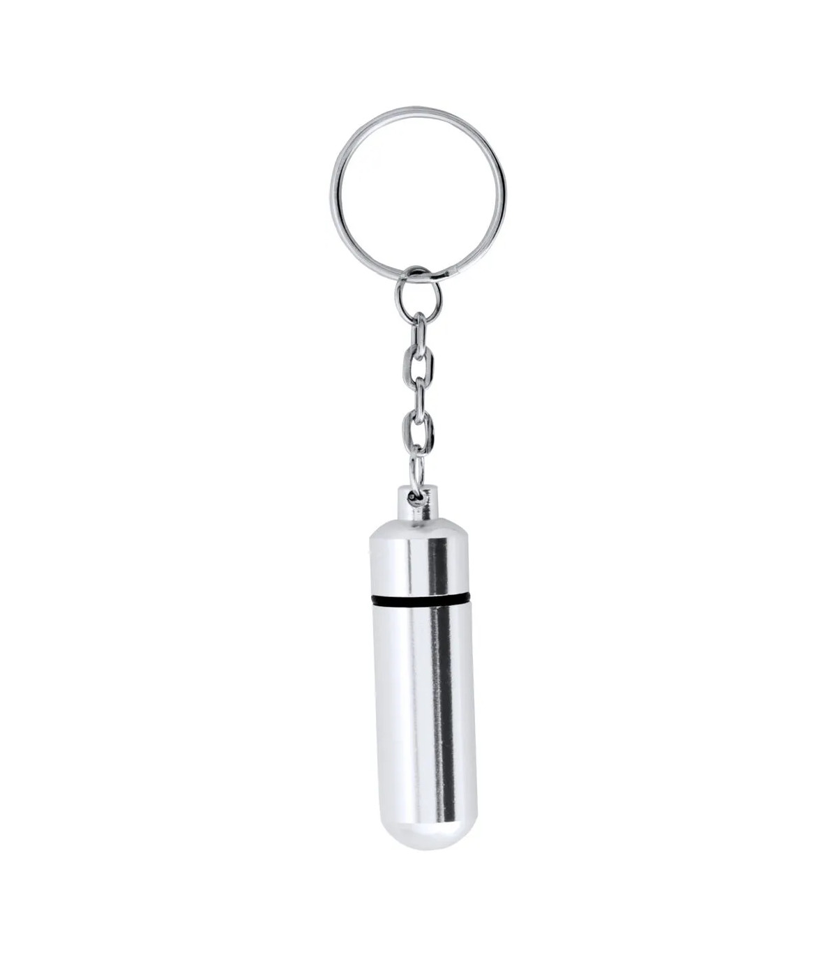 Llavero pastillero de discreto diseño con cuerpo en aluminio de acabado brillante y cierre a rosca.