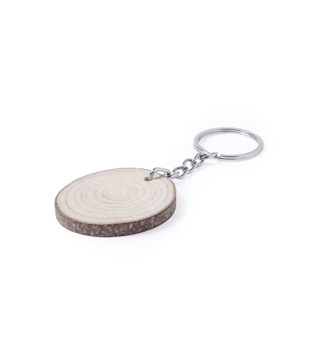 Elegante llavero de línea nature. Piezas obtenidas al corte de madera de haya, por lo que su textura, color y grosor pueden variar, convirtiéndolo así en una pieza única.Con amplia superficie de marcaje y disponible en diseños ovalado y redondeado.