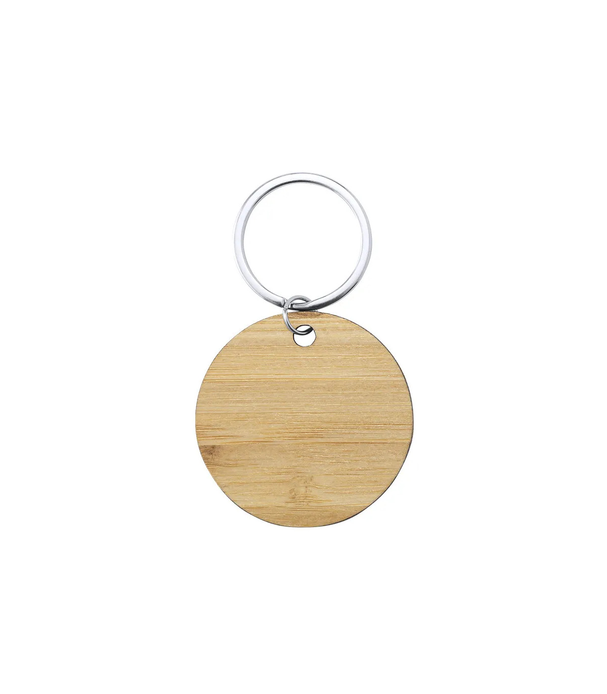 Llavero de línea nature fabricado en bambú, disponible en diseños circular, cuadrado y rectangular.