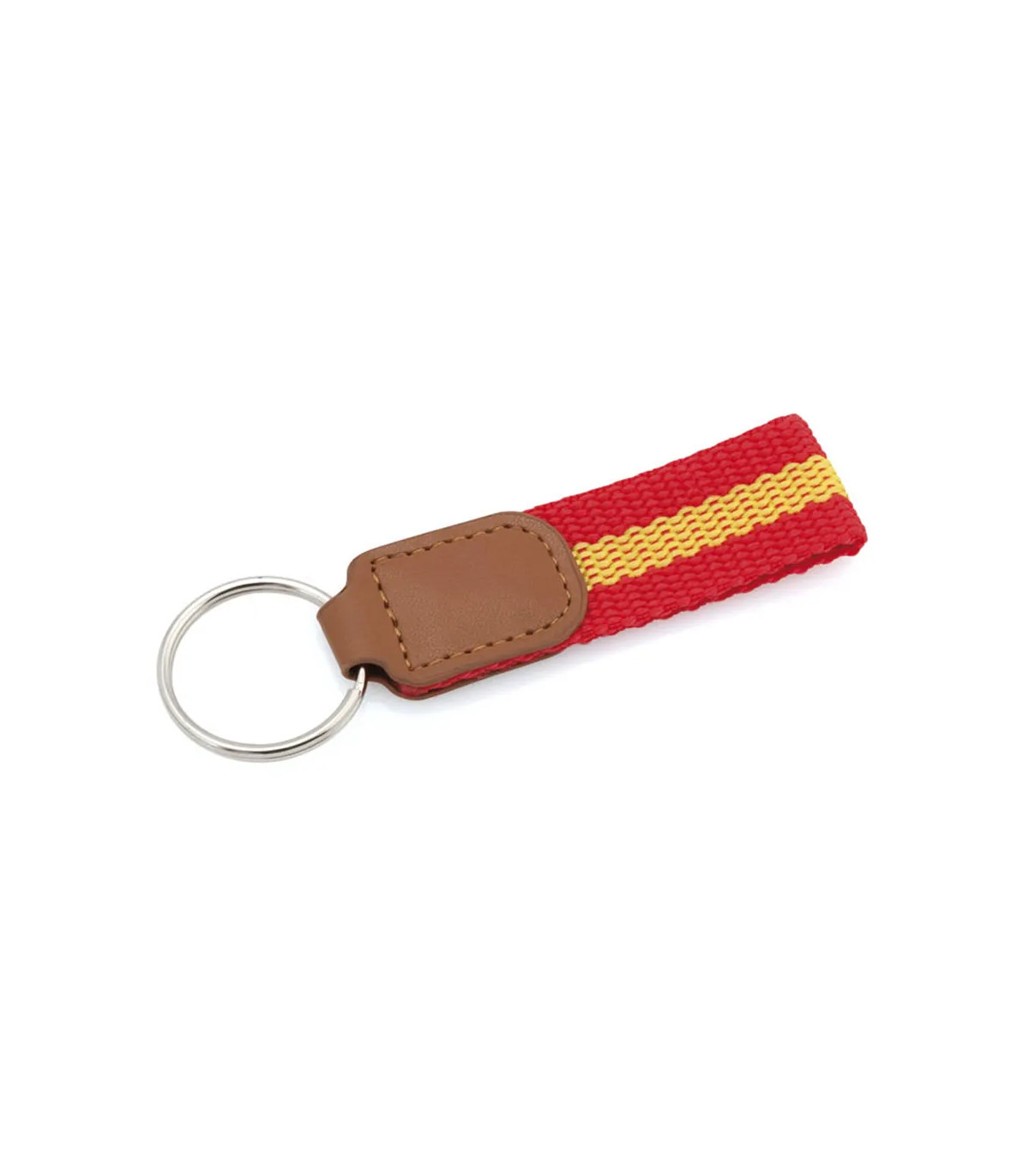 Llavero de poliéster con accesorios de bandera española en la cinta y refuerzo en polipiel de color marrón.