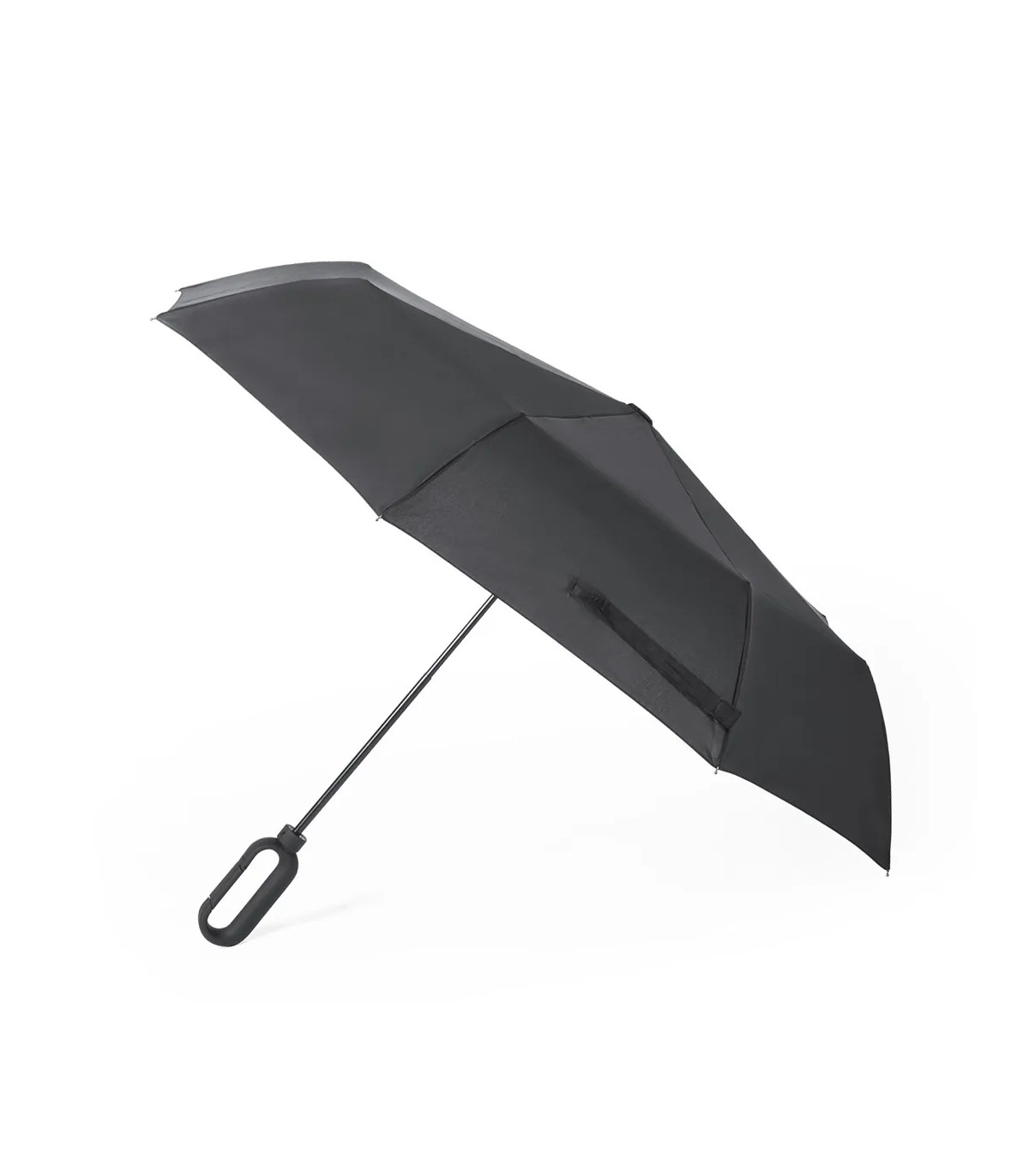 Paraguas plegable de 8 paneles en variada gama de colores. De 100cm de diámetro, apertura manual, con sistema antiviento y en resistente material pongee. Con varillas de fibra en color negro, cierre de velcro y mango ergonómico con mosquetón de enganche integrado. Presentado en funda individual a juego.