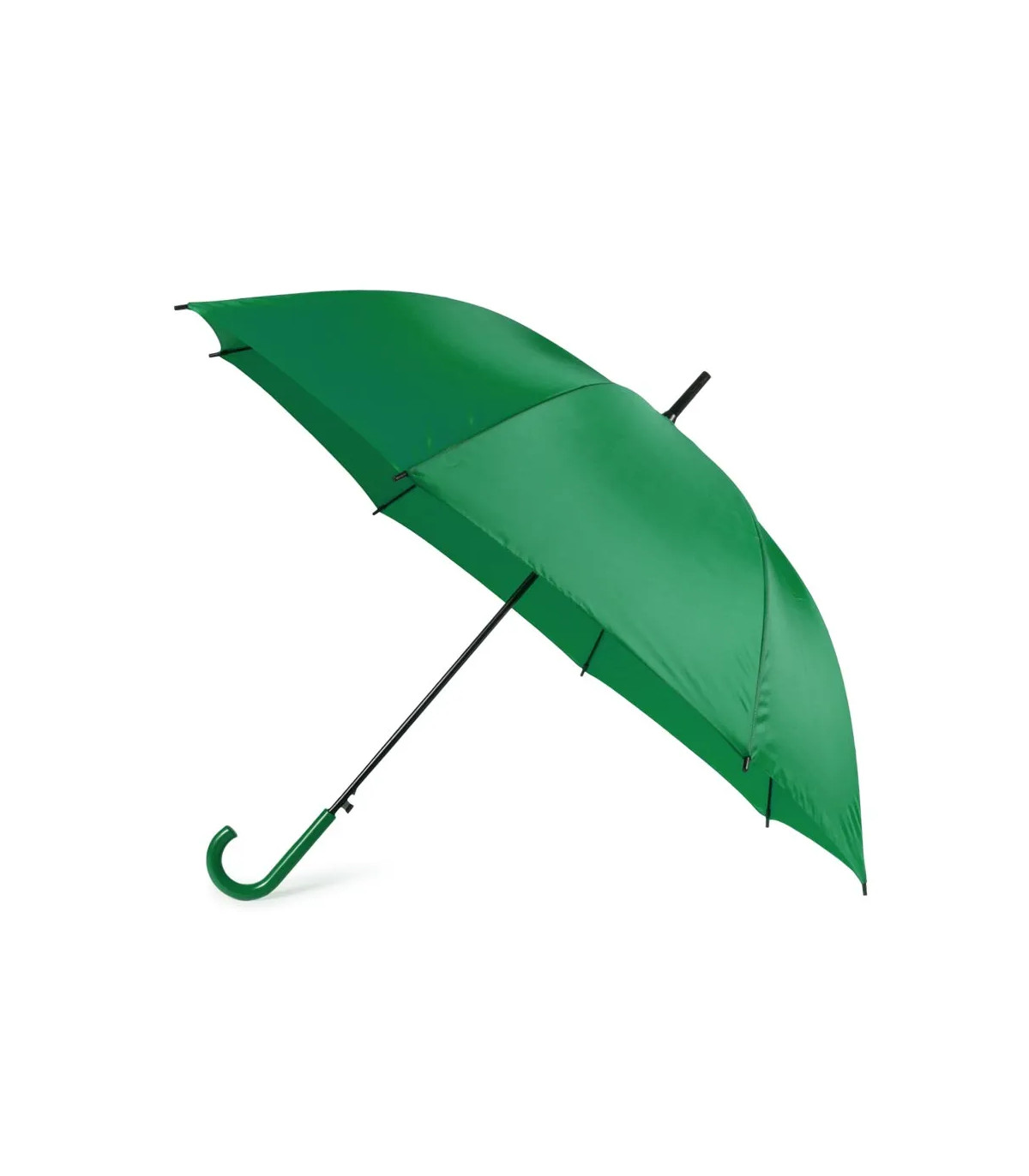 Paraguas de 8 paneles en extensa gama de vivos colores y 105cm de diámetro. De apertura automática, en resistente material poliéster, con varillas metálicas en color negro y mango a juego.